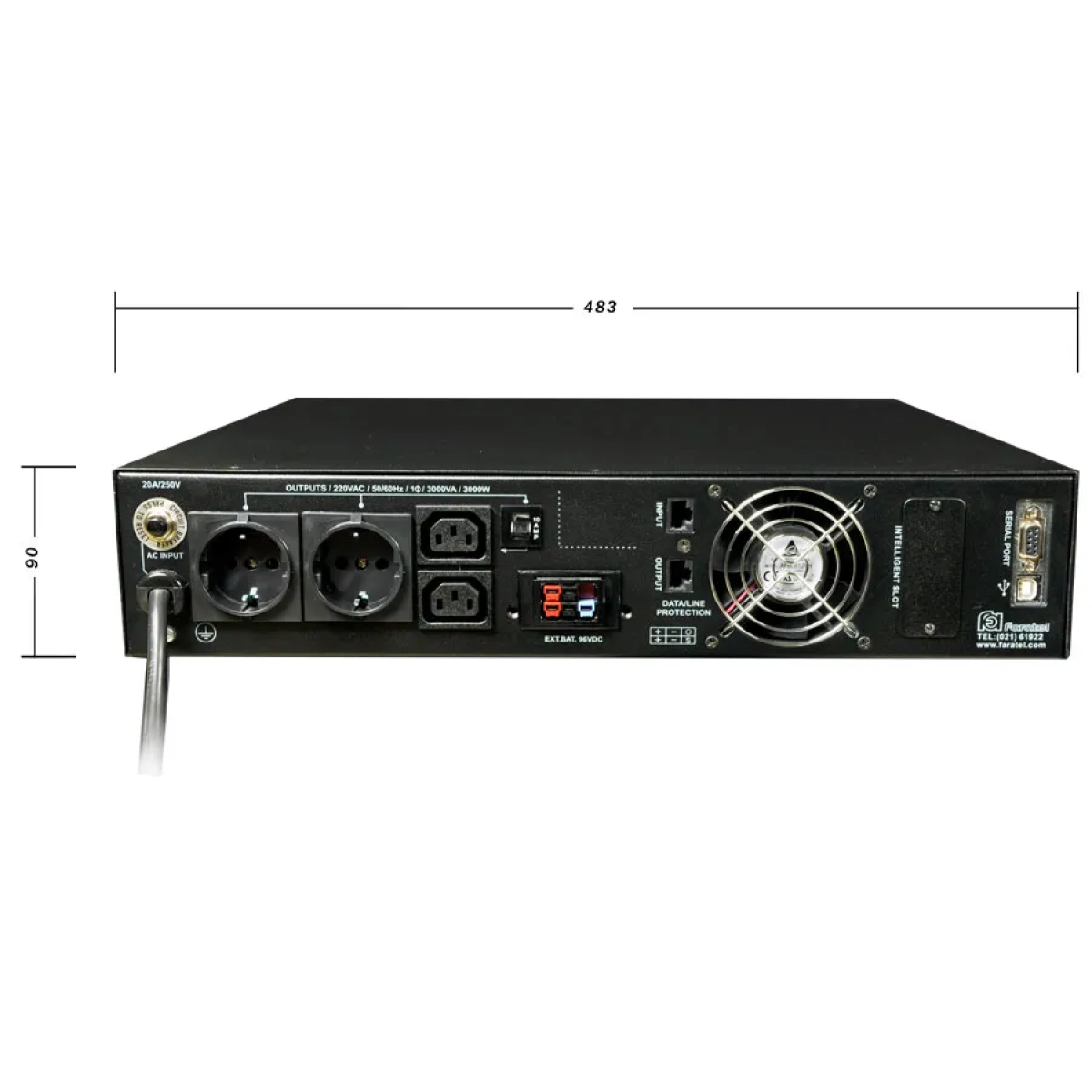 یوپیاس DSS3000X-RT فاراتل با توان ۳۰۰۰ ولتآمپر و طراحی رکمونت مناسب تجهیزات شبکه و امنیتی است. دارای نمایشگر LCD و قابلیت افزایش زمان پشتیبانی با باتری خارجی.