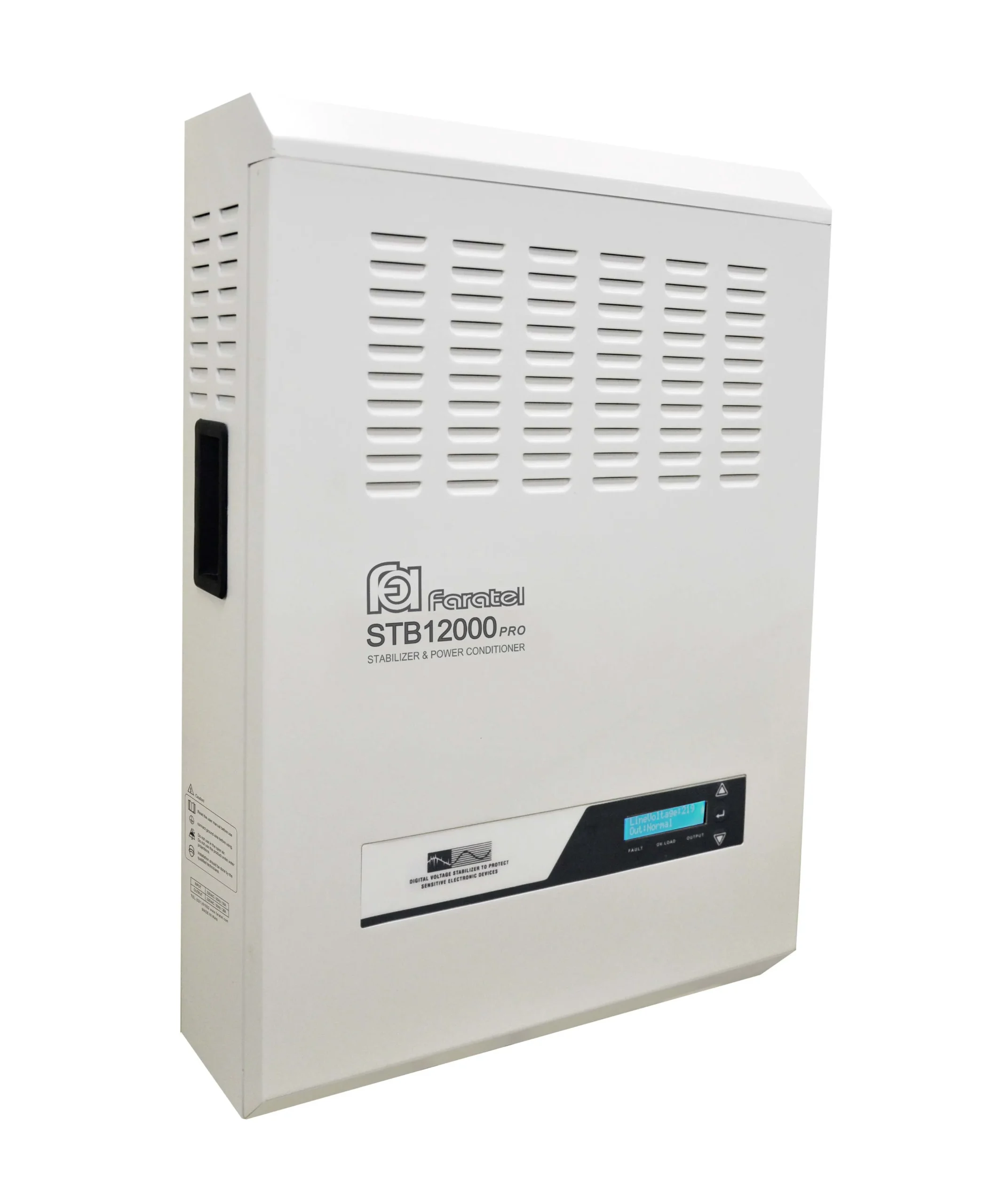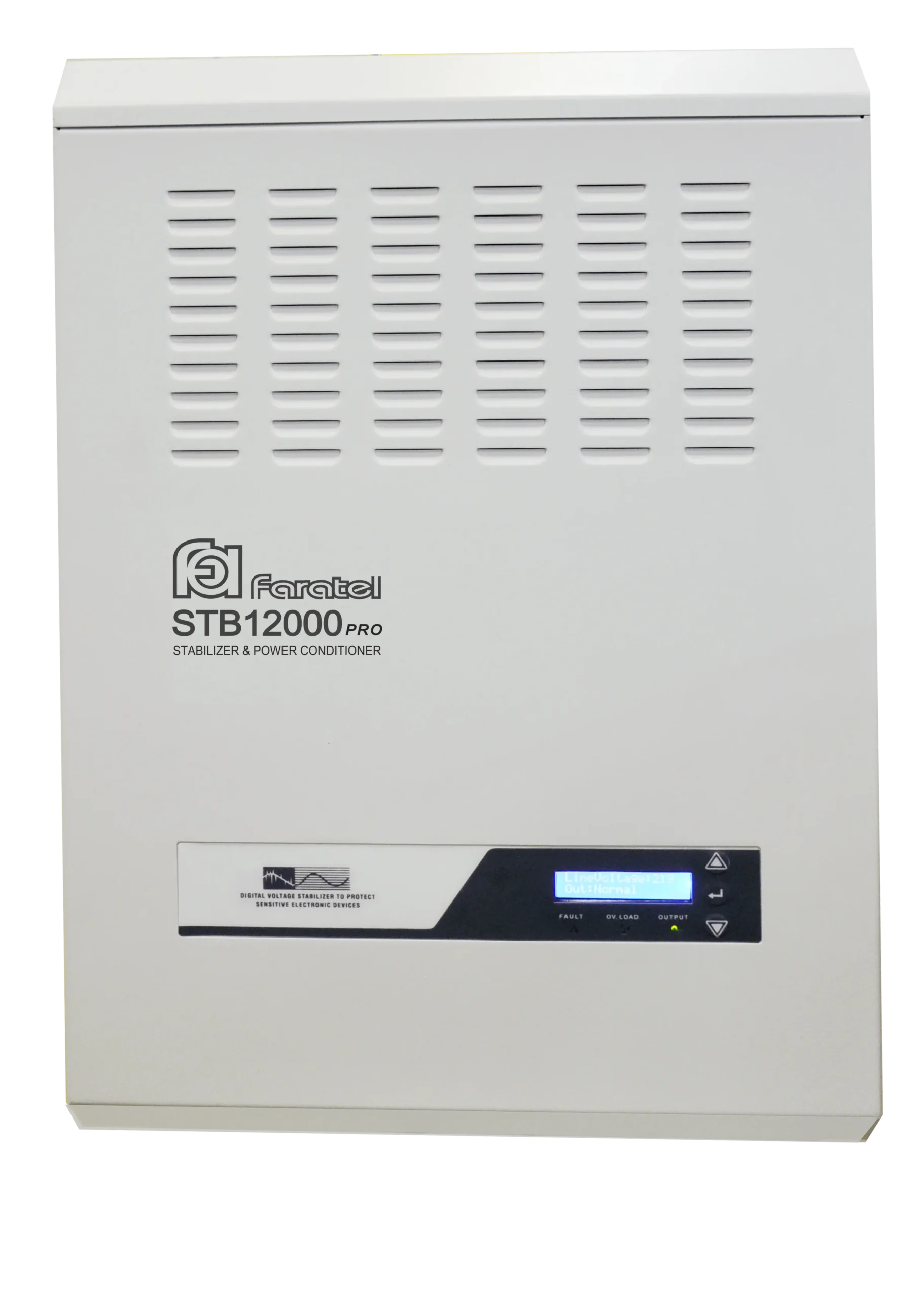 استابیلایزر فاراتل مدل STB12000 PRO یک تثبیت‌کننده ولتاژ تک‌فاز ۱۲kVA قدرتمند است که برای محافظت از تجهیزات برقی منازل، واحدهای اداری و ساختمان‌های دارای کنتور تک‌فاز طراحی شده است. این مدل با کنترل میکروکنترلری، ۸ مرحله تقویت و ۵ مرحله تضعیف ولتاژ، بازه ورودی وسیع 125 تا 300 ولت، فیلتر نویز و پنل LCD، ولتاژ برق شهر را به‌صورت پایدار و ایمن تأمین می‌کند.