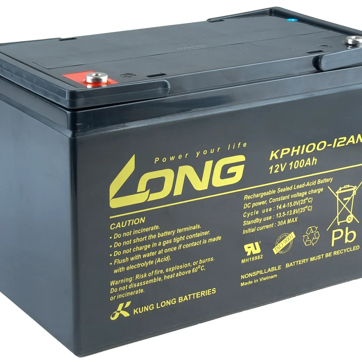 باتری ۱۲ ولت Long KPH100-12AN با ظرفیت ۱۰۰ آمپر ساعت، تکنولوژی AGM VRLA و کارایی بالا. ساخت ویتنام، مناسب سیستمهای برق اضطراری، تجهیزات صنعتی، مخابرات، شبکه، روشنایی اضطراری و کاربردهای عمومی ۱۲ ولت. کاملاً سیلد و بدون نیاز به نگهداری.